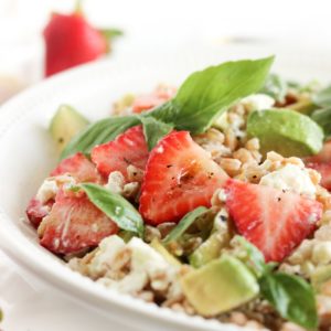 We’re loving this Strawberry Avocado Farro Salad from registered dietitian Kaleigh McMordie! It uses strawberries in a lunch or side dish that’s so satisfying. Not only are strawberries delicious, there are so many health benefits that strawberries offer. One serving of eight strawberries provides a day’s worth of vitamin C. Paired with whole grains, herbs and avocado, this strawberry salad will be your new favorite way to get in 8 strawberries a day. Try it with grilled chicken or steak for a heartier meal. Enjoy!