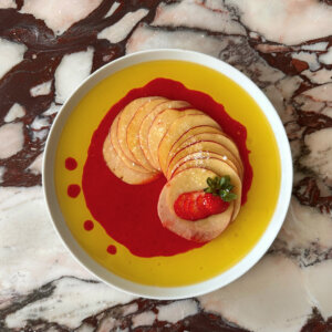 Apple Carpaccio in Strawberry Coulis with Burrata and Sourdough