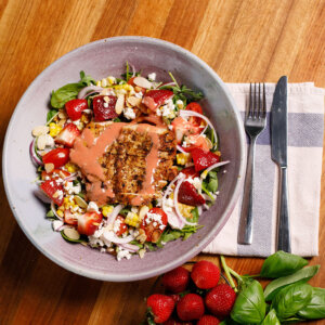 For assembly, add spinach and arugula into the bowl. Then top with red onions, tomatoes, corn, and the marinated California strawberries. Next, drizzle a healthy amount of the dressing over top of the salad. Then finish with toasted almonds, crumbled feta cheese, and the sliced Cajun chicken.
