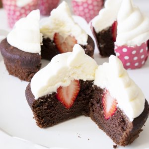 Fill paper-lined muffin cups two-thirds full. Bake for 12 to 15 minutes or until a toothpick inserted near the center comes out clean. Cool for 10 minutes before removing from pans to wire racks to cool completely. Using a paring knife, core out a well down into each cupcake, for your hulled strawberry to fit into. Stick the strawberry pointy side down into your cupcakes. Take the piece of the cupcake that you cut out, and place it on top of the strawberry, after you push it down into the cupcake.