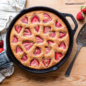 Pour the liquid ingredients over the dry ingredients and whisk until smooth. You’ll have a thick batter. Fold in strawberries. Pour into the prepared pan and spread the batter evenly. Top with the sliced strawberries, and sprinkle with Turbinado sugar, if using.