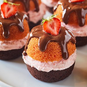 Garnish tops of cakes with slices of strawberries and reserved chocolate chips before serving.
