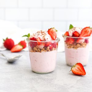 Mix strawberry purée into yogurt until it is fully combined and a pink color.