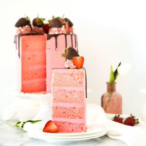 Pipe swirls of buttercream around the top of the cake, sprinkle with sprinkles, and place chocolate-covered California strawberries on top of each swirl.
