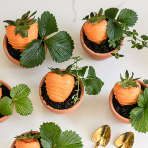 Cut a tiny hole at the bottom of the piping bag and pipe horizontal lines onto each strawberry to make it look like a carrot.