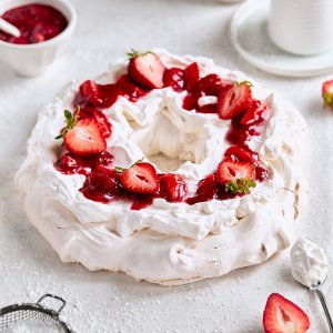 Make ahead: Strawberry sauce can be made 1-2 days in advance and refrigerated until ready to use. Meringue can be made 1 day ahead and stored in an airtight container overnight. Assemble wreath just before serving.