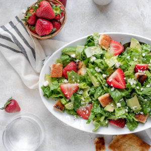 In a large bowl, combine strawberries, avocado, lettuce, and ¼ cup of the dressing.