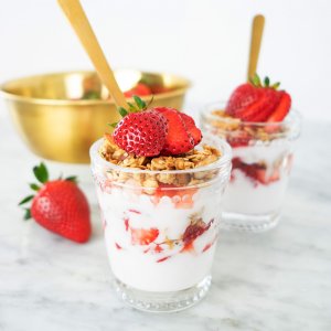 To make the parfait, layer ¼ cup yogurt, 1/4 cup chopped strawberries and ¼ cup granola in a parfait dish. Repeat.