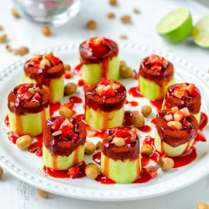 Fill the cucumber cups with peanuts and chopped strawberries. Sprinkle chopped tamarind candy on top.